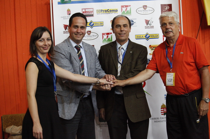 WNBA Vizepräsident Veronika David, Stellvertreter Staatssekretär für Sport Herr Norbert Kiss, WNBA Präsident Ludwig Kocsis und Bela Csanyi 9xWeltmeitester